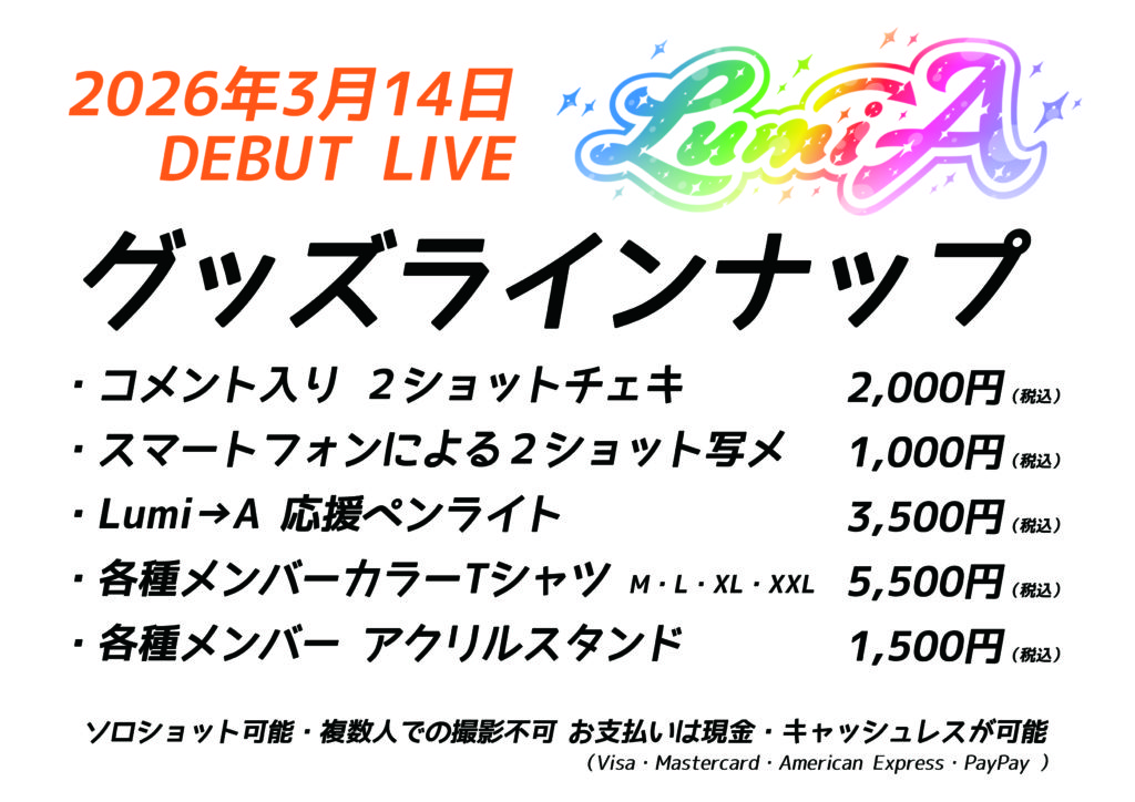 2026年3月14日(土)にGOTANDA G7にて「Lumi→a デビューライブ」をグッズ情報を更新しました☆彡
